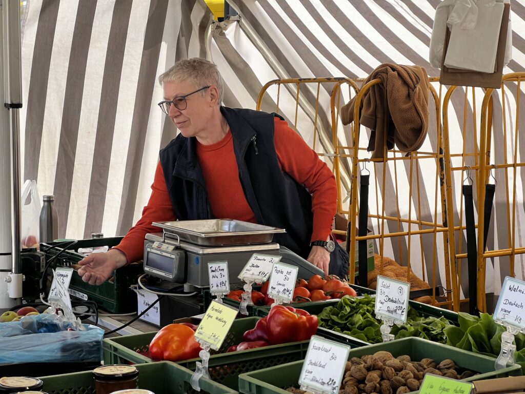Le panier de pro­duits avec lequel repart la consom­ma­trice régu­lière du mar­ché de Marien­platz est pro­duit dans la ferme maraî­chère de Schu­ma­cher Gemüse, située à Kön­gen, une com­mune du Bade-Wur­tem­berg. Cela fait deux ans que la ferme a obte­nu le label bio.