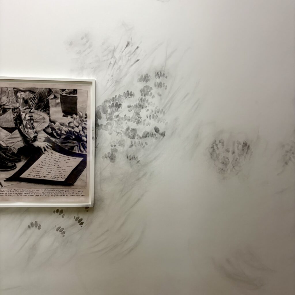 État des dégâts : autour d’archives de presse encadrées et placardées aux murs par l’artiste Katrin Ströbel (née en 1975), les murs apparaissent salis. Des traces noires de charbon parsèment les murs. Ce qui ressemblait à l’un de ces musées bien entretenus que l’on croise dans toutes les grandes villes du monde, s’apparenterait à un lieu laissé à l’abandon sans nettoyage, quelques jours à peine avant sa fermeture. Que nenni. Les tâches font en fait partie de l’œuvre de Katrin Ströbel, ensemble de photos et de fresques à main levée nommé About Touching and Understanding (2021). Même la salissure est orchestrée au Kunstmuseum.