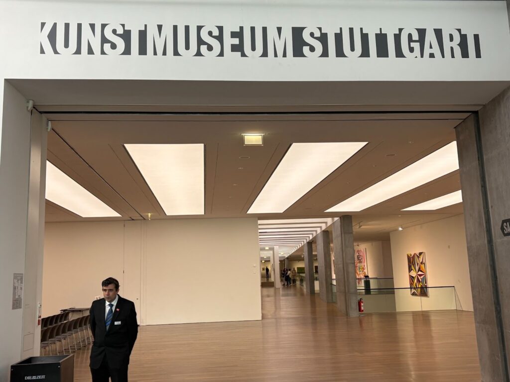 Place du château à Stuttgart, le musée d’art de la ville se dresse fièrement de sa dizaine de mètres de haut. Cet immense cube de baies vitrées tranche avec l’architecture ancienne du reste de la place : un palais baroque et château fort datant du Xème siècle. Le musée ressemble à un bunker, mais on y pénètre facilement par deux immenses portes coulissantes automatiques, après avoir traversé une terrasse aux grands parasols blancs où des touristes sirotent des limonades. L’atrium en cathédrale abrite un café, un bar en béton, une librairie, et une caisse sculptée en bois sombre. L’impression d’être transporté dans un fantasme d’esthétique minimale des années 1990.